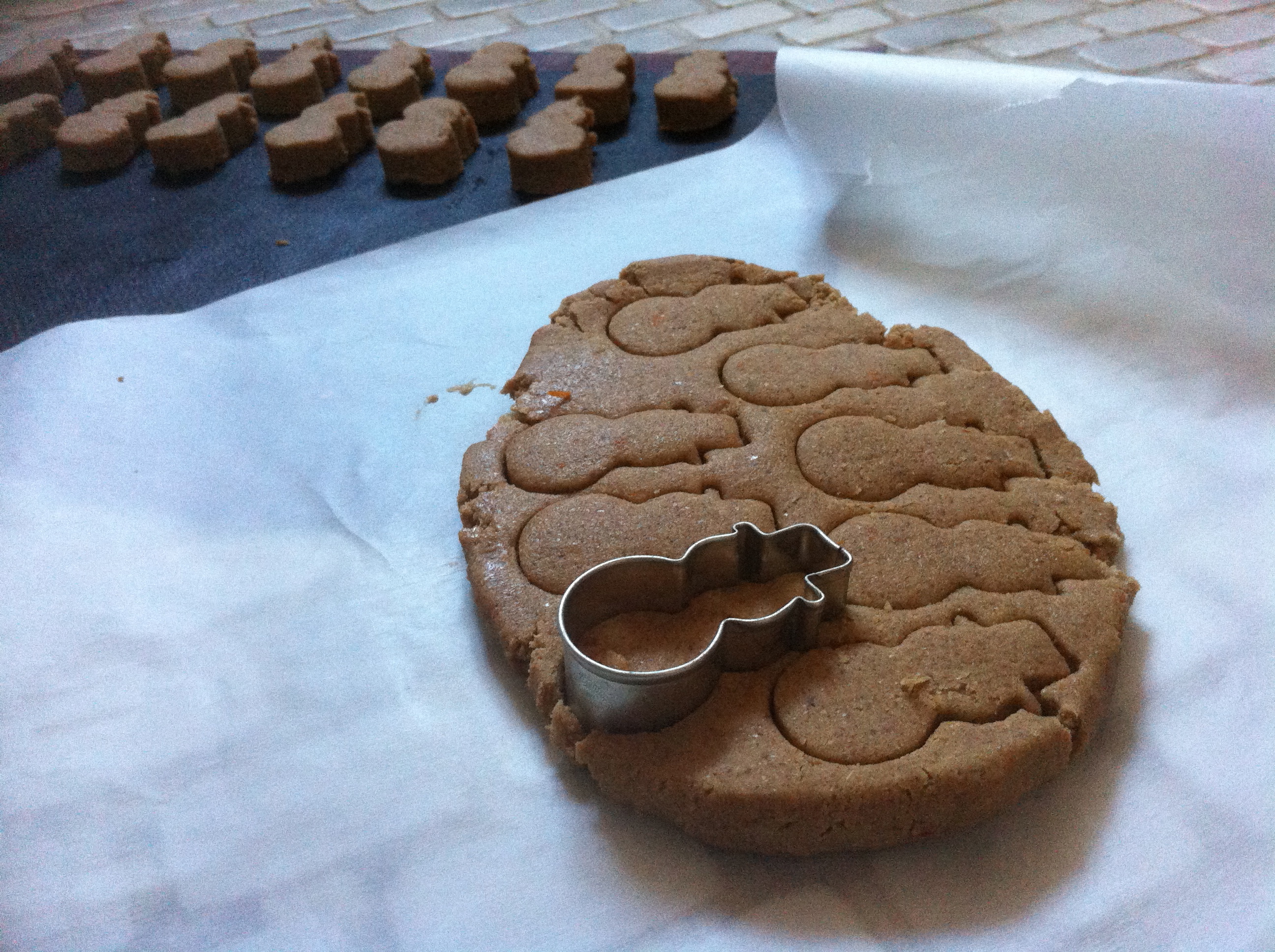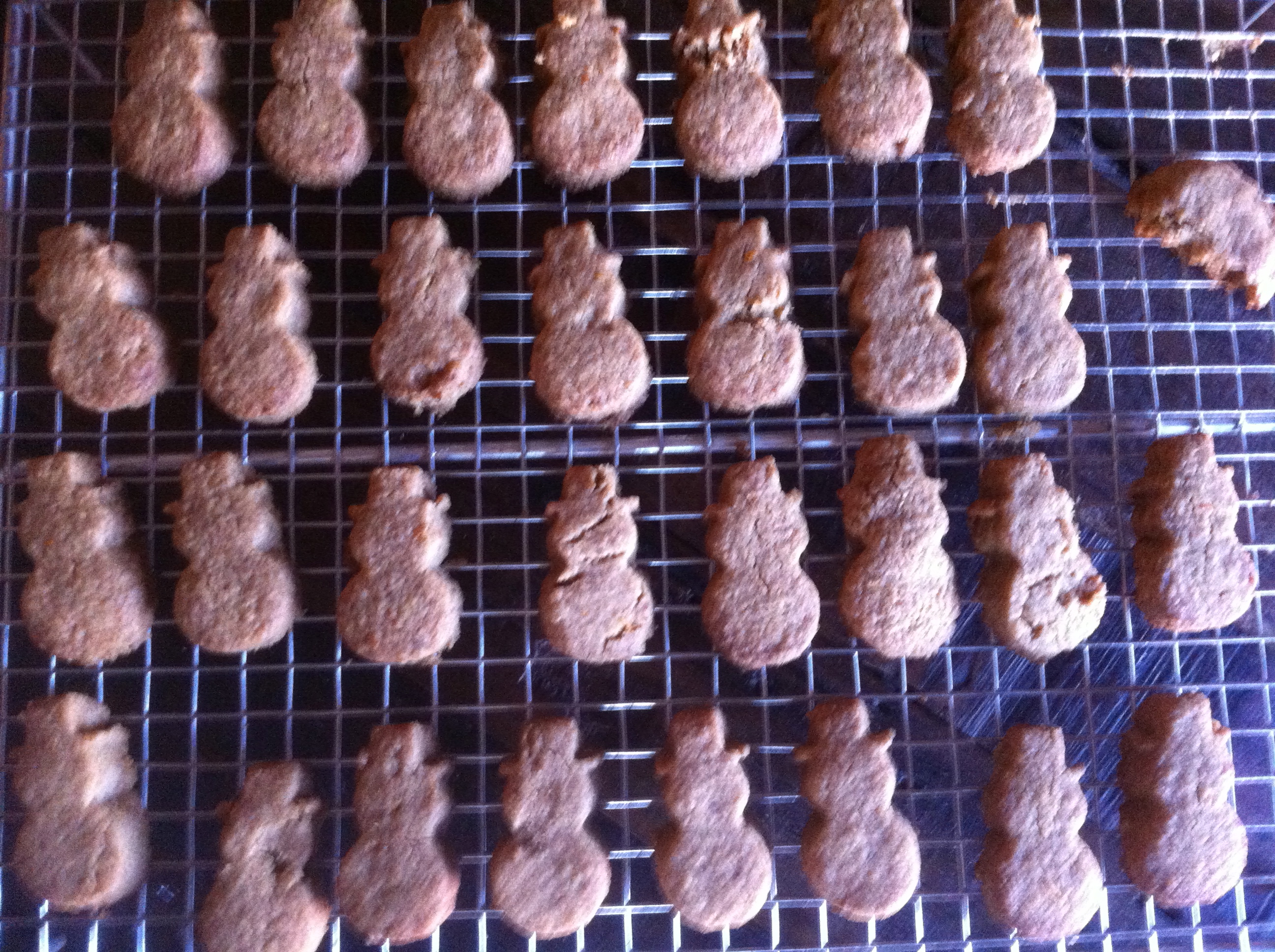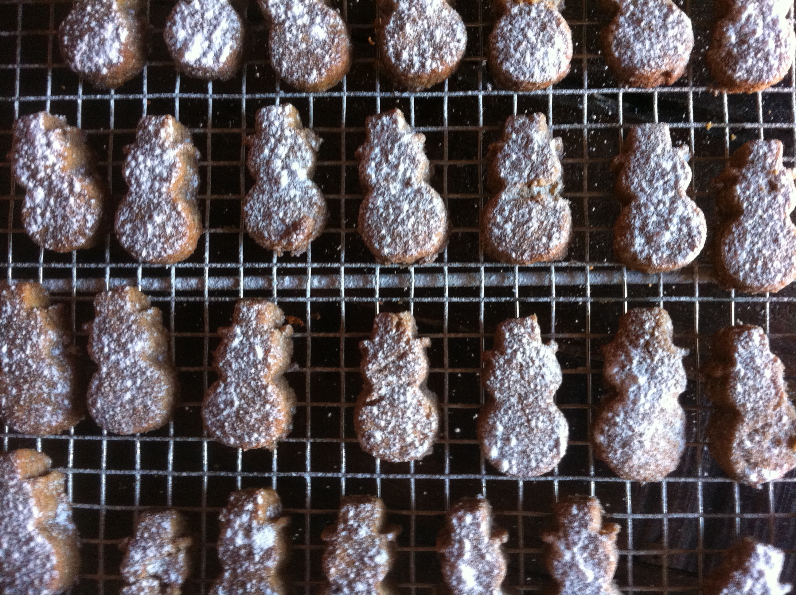 7.  Para polvorones clásicos, utilizar un cortapastas redondo o cuadrado e ir colocando los polvorones sobre una bandeja de horno preparada para que no se peguen. Para niños podéis usar un cortapastas con forma, pero que no sea muy enrevesada porque los polvorones tienden a quebrarse. Aquí los hemos hecho con forma de muñeco de nieve y han sido un éxito.