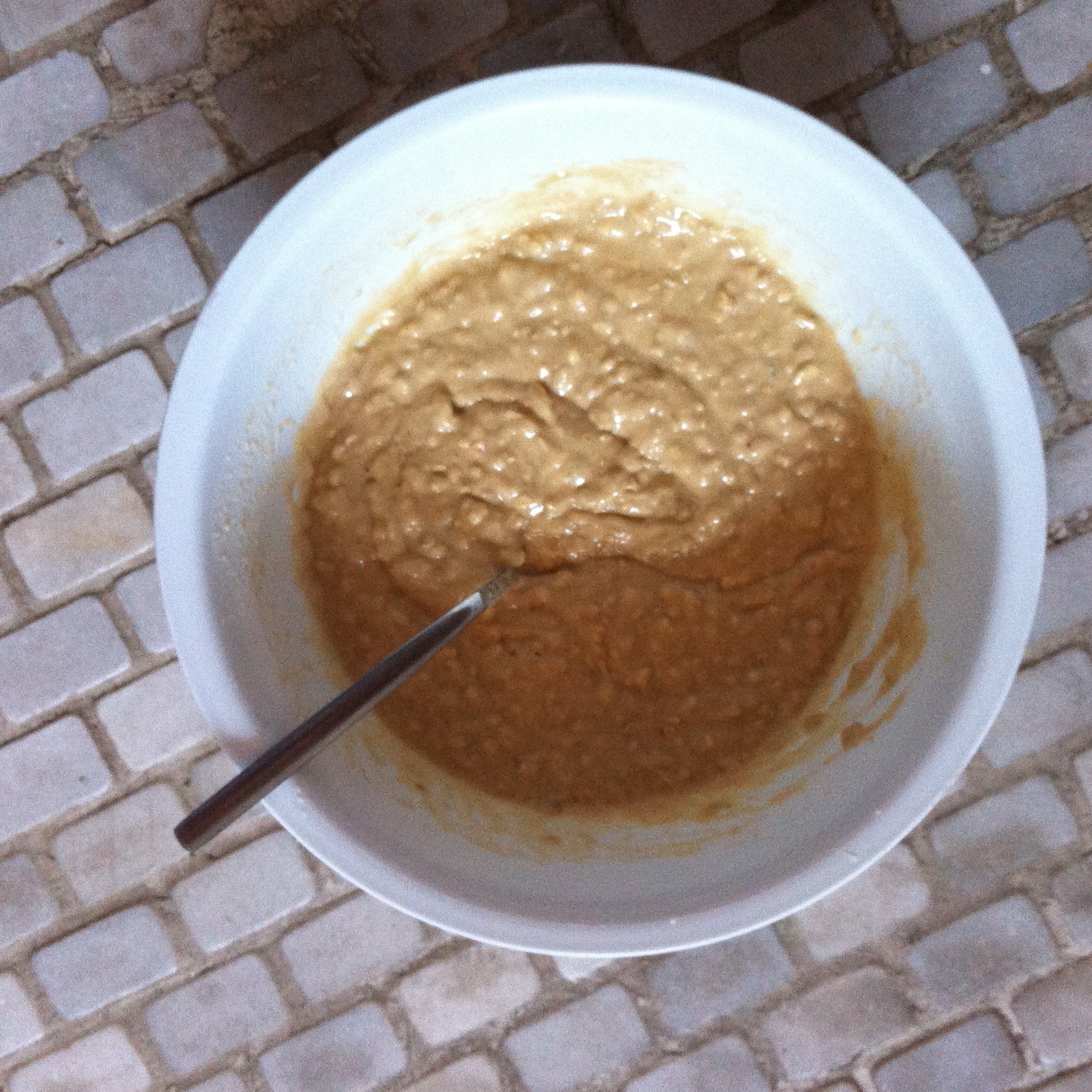 - Añadimos el aceite, el vinagre de manzana (o el zumo de limón), la compota y la leche. Mezclamos muy bien con una cuchara. Queda una masa muy espesa.