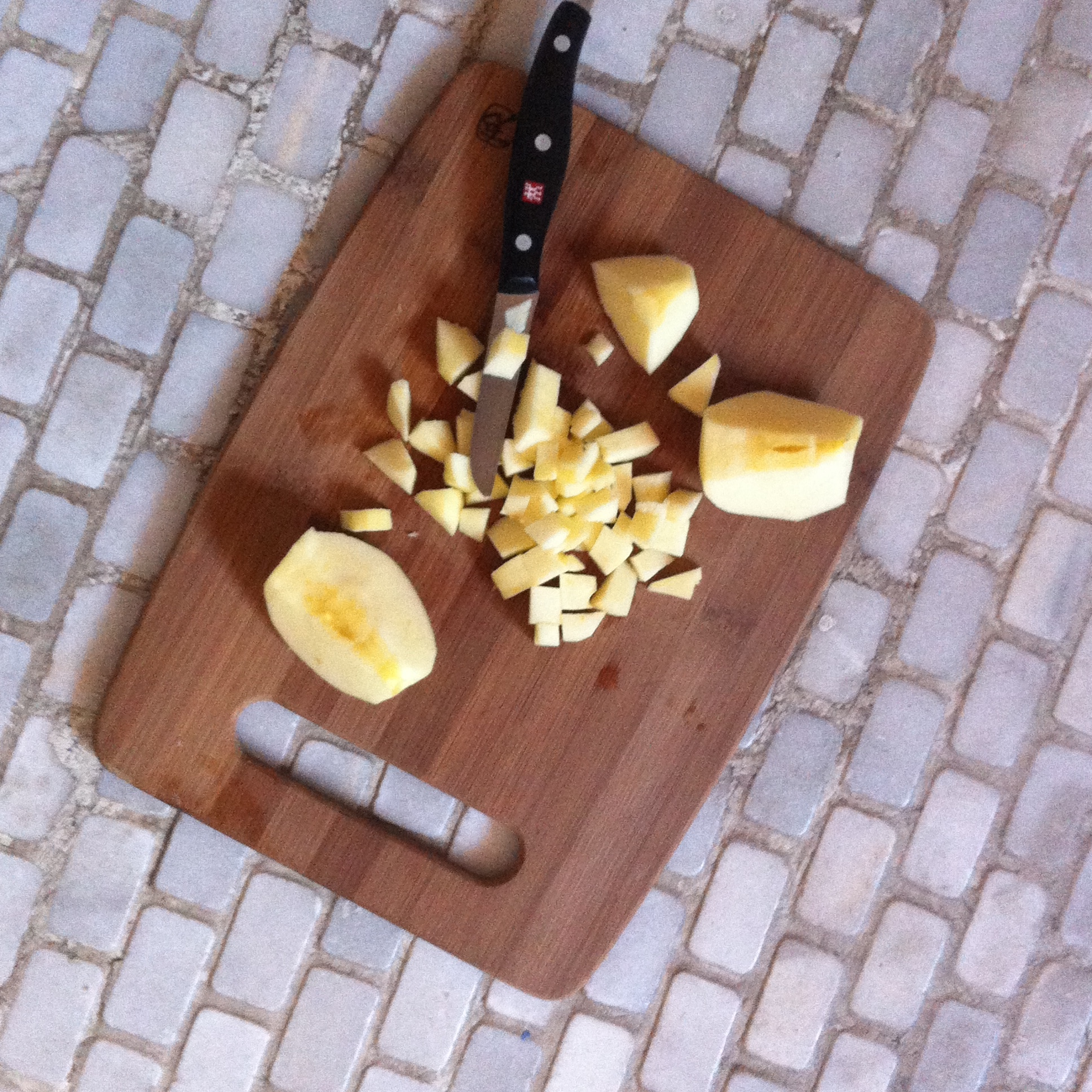- Vamos calentando el horno a 180º. Pelamos y troceamos la manzana en taquitos pequeños, quitándole el corazón y las pepitas.