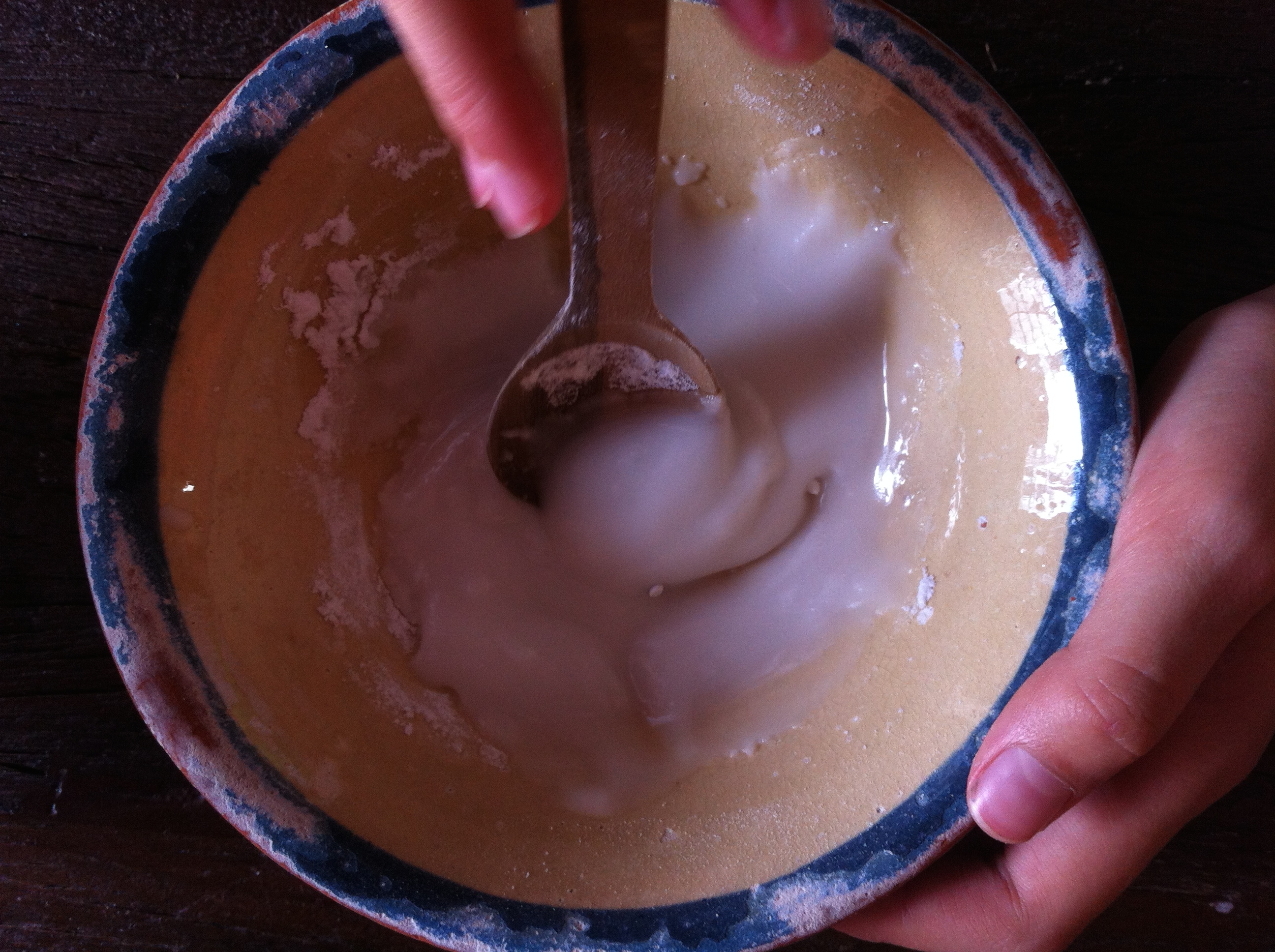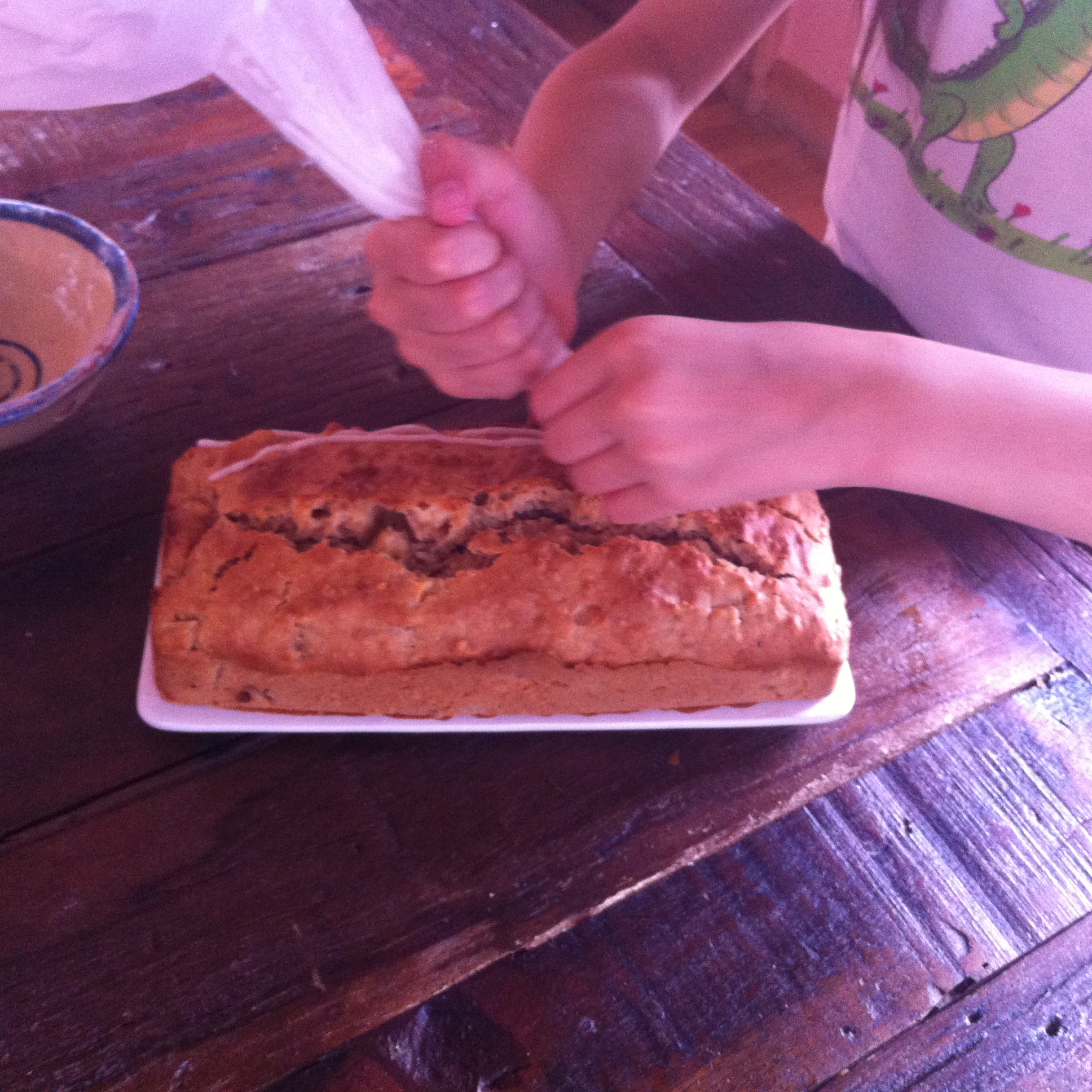 Nuestra glasa sin embargo es agua y azúcar, y es facilísima. Me enseñó a hacerla Virginia Martín en el curso de galletas de La cocina de Babette. A Julia le encanta porque cuando lleva sus cupcakes decorados con glasa al cole o a los cumples , mola mucho. (En otoño, prometido, receta de cupcakes para cumpleaños). Y encima es fácil de manejar. Julia «pintó» todo este bizcocho sin ayuda. Cualquier dibujo que hagas queda bonito… El bizcocho resultó aromático, de miga densa y jugosa, muy sabroso. Estaba buenísimo, vaya, para alérgicos y para todos.